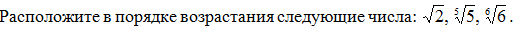 В порядке возрастания : корень шестой степени из 6* корень пятой степени из 5 * квадратный корень из 2.
