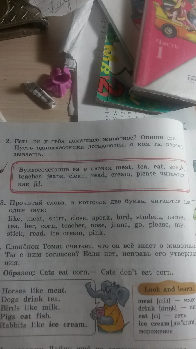 meat, speak, tea, teacher, jeans, please, read, ice cream.