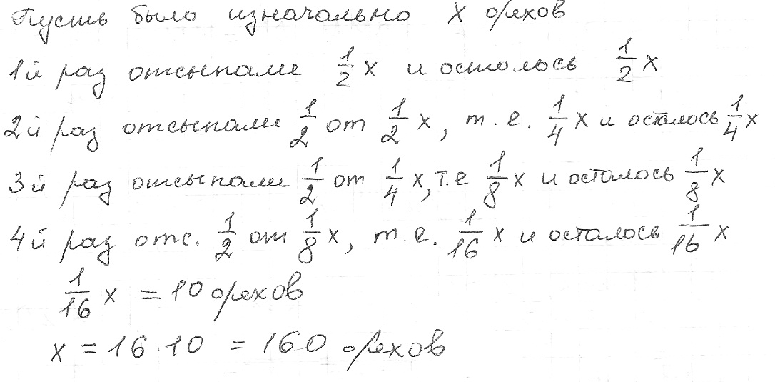 Из корзины отсыпали половину орехов,потом еще половину остатка,затем половину нового остатка и,наконец,оловину следующего остатка.После этого в корзине осталось 10 орехов.Сколько орехов было в корзине первоначально?