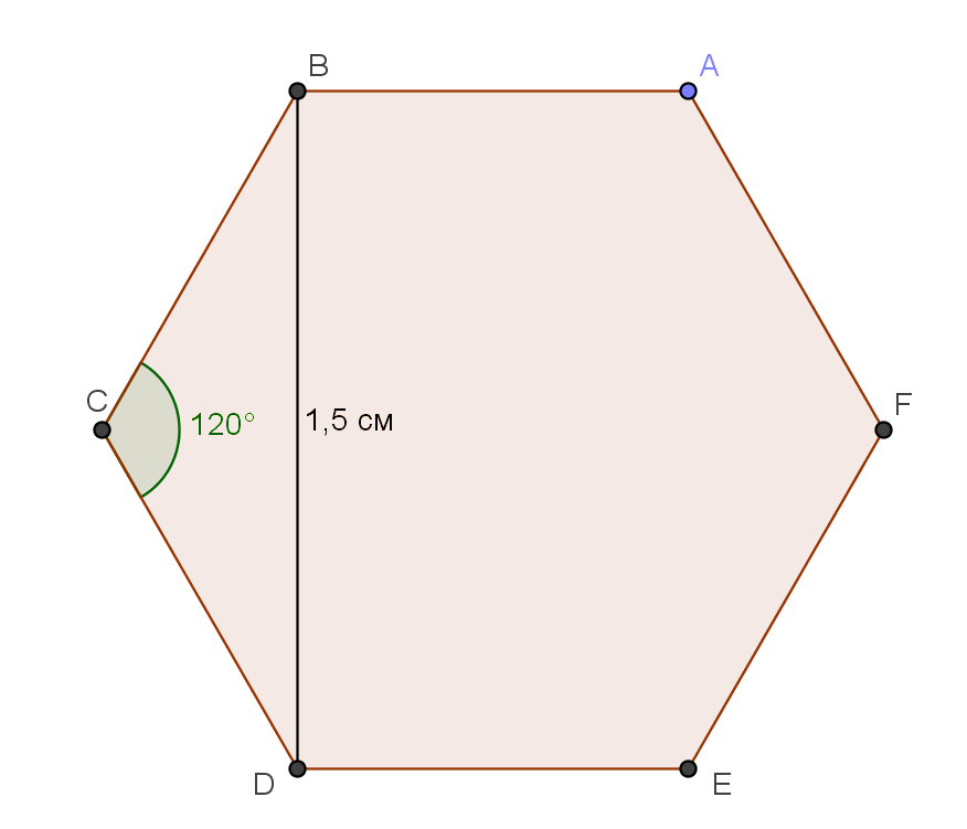 Растояние между параллельными гранями шестигранной головки болта,верхнее основание которого имеет форму правильного шестиугольника, равно1,5см. найдите площадь верхнего основания! люди помогите пожалуйста, всю голову уже сломали.