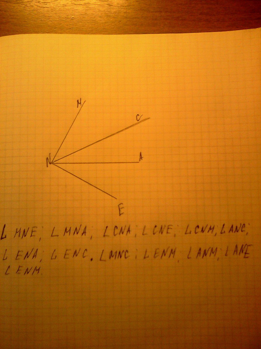 Начертите углы MNE и проведите лучи NA и NC между его сторонами. Запишите все его образовавшиеся углы