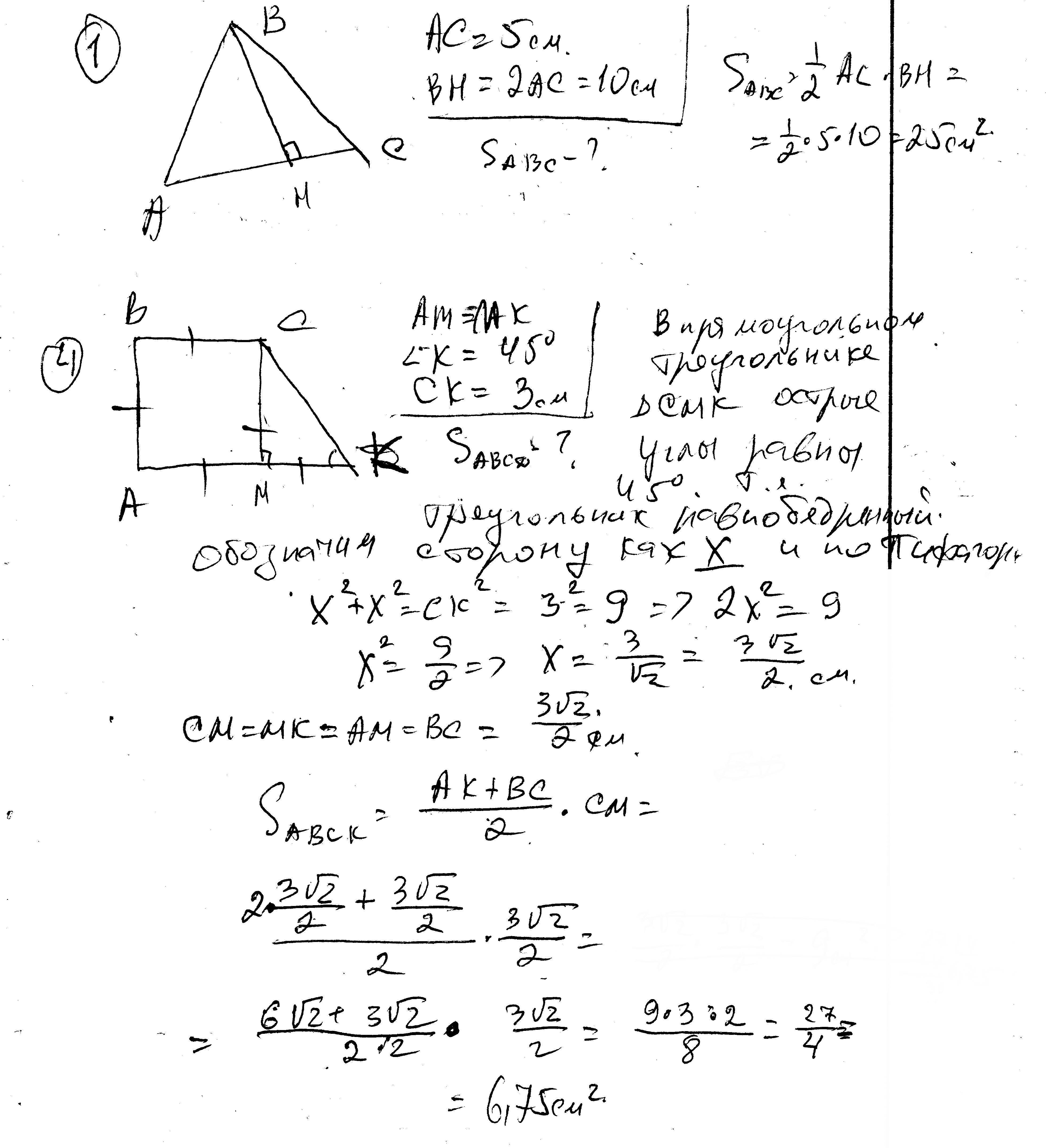 1). Сторона треугольника равна 5 см, а высота, проведенная к ней, в два раза больше стороны. Найдите площадь треугольника.