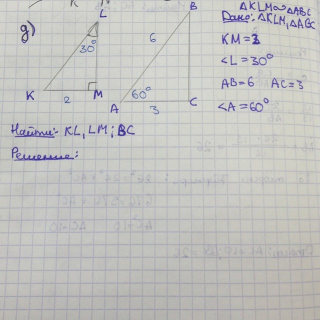 1) в КЛМ уг К=180-90-30= 60гр значит соответств стороны KL~AB LM~BC KM~AC