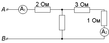 решите плиз : определите общее сопротивление цепи аб если первый амперметр показывает 2 а , а показания второго равны 1 а ( картинка прикреплю, ответ