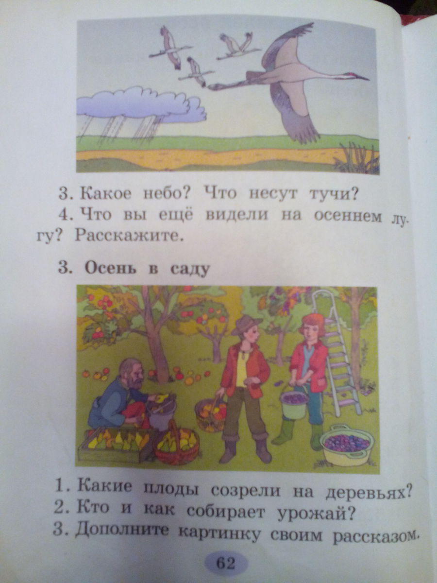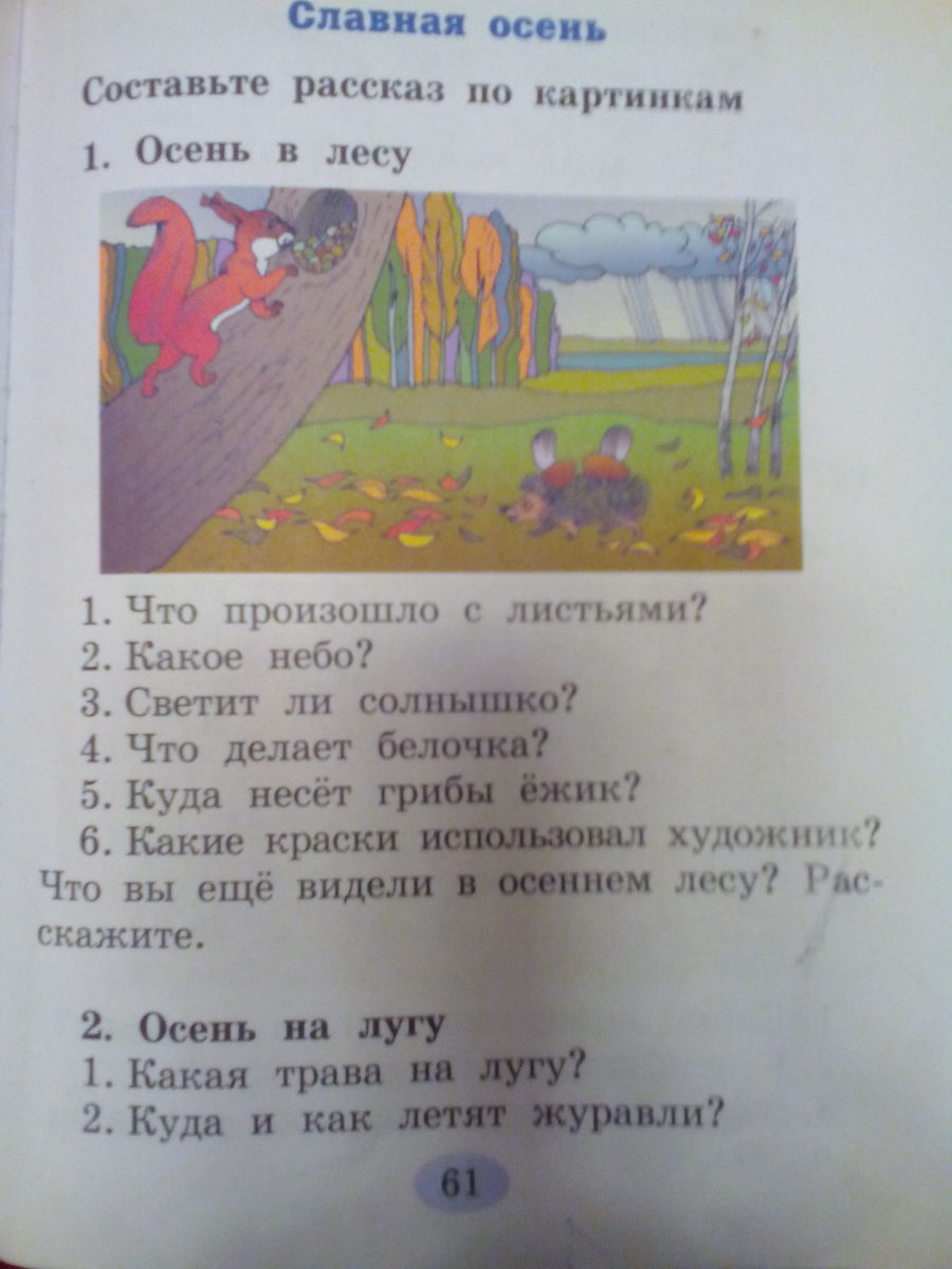 Осень. Вдалеке тусклое небо с дождём. Дует сильный ветер и поднимает все листья вверх. Белочка быстро убирает все свои снасти. Ёжик как можно быстрее бежит к своей норке. Вдали деревья качаются от порывестого ветра.