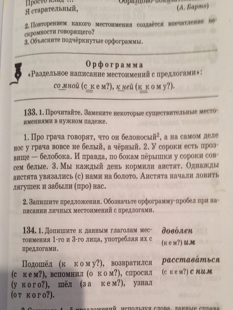 1.Про грача говорят,что он белоносый,а на самом деле нос у него вовсе не белый,а черный.2.У сороки есть прозвище-белобока.И правда,по бокам пёрышки у неё совсем белые.3.Мы каждый день кормили аистят.Однажды они увязались с нами на болото.Они начали ловить лягушек и забыли про нас.