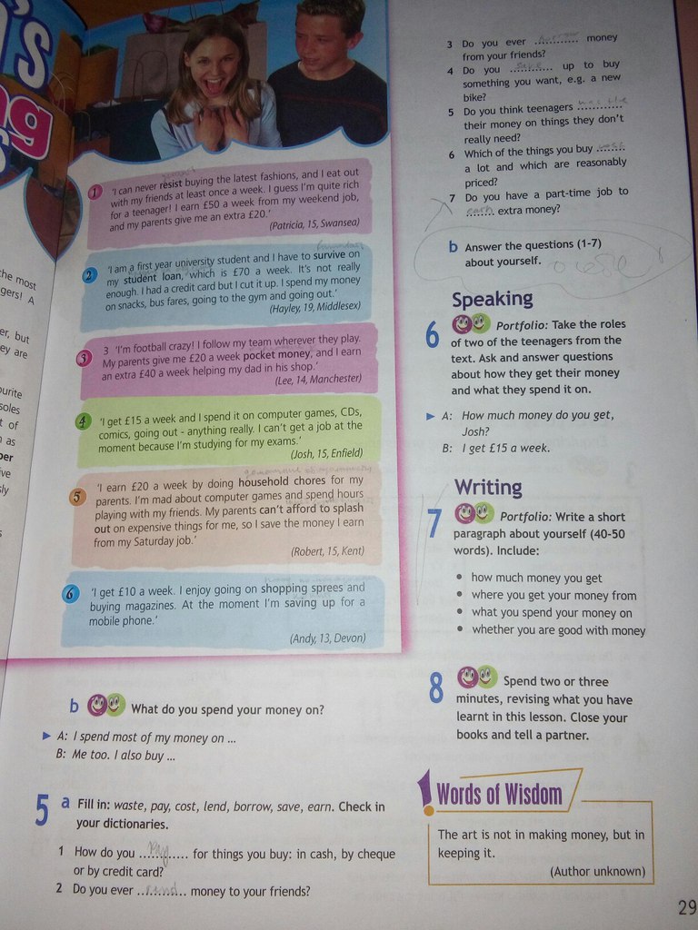 As for me, I like going shopping. I love to buy the latest fashions, fashion magazines and of course I enjoy going out with my friends. Unfortunatelly, my parents can't afford to pay for all the things that I want. That is why I have a part-time job. After school three times a week I work as a delivery person - I deliver mail from my office to different people and organizations in town. This is very interesting work - I can meet new people, when delivering mail to them. And of course I earn some money - about 1000-1500 rubels a week. Sometimes the dress I want to buy is expensive and I have to save up some money for a week or two to buy it. I also earn some pocket money from my parents by doing household chores. I earn about 1000 rubles a month. I think I am good with money. I know how to earn it, how to save it and how to spend it.