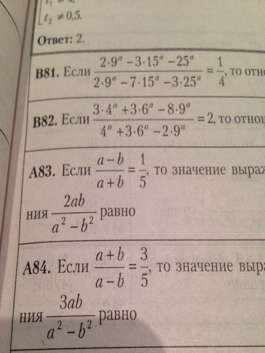 frac{a-b}{a+b}=frac{1}{5}; ; ; to ; ; ; 5(a-b)=a+b\\5a-5b=a+b; ; to ; ; 4a=6b; ; to ; ; a=frac{3}{2}b\\ frac{2ab}{a^2-b^2} =frac{2cdot frac{3}{2}b^2}{frac{9}{4}b^2-b^2}= frac{3b^2}{frac{5}{4}b^2}= frac{12}{5}  \\\2); ;  frac{a+b}{a-b} =frac{3}{5}; ; to ; ; 5(a+b)=3(a-b); ; to ; ; 5a+5b=3a-3b\\2a=-8b; ; to ; ; a=-4b\\ frac{3ab}{a^2-b^2} = frac{3(-4b)cdot b}{16b^2-b^2} = frac{-12b^2}{15b^2} = -frac{4}{5}