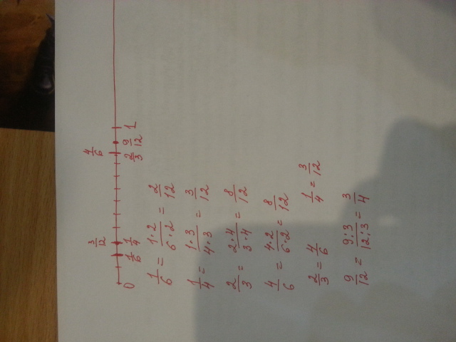 отметь на числовом луче дроби 1/6, 1/4, 2/3, 4/6, 3/12, 9/12 ( e=12 клеток). Какие из этих дробей равны? Как связаны между собой числители и знаминатели равных дробей? Приведи пример дроби, равной 9/12, но имеющий другой числитель и знаменатель.