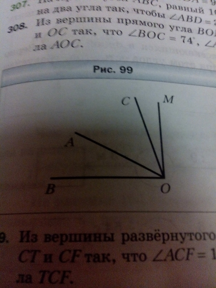 из вершины прямого угла BOM(рис.99)проведены два луча ОА и ОС так,что Boc=74 градуса а угол АОМ 62 градуса.Вычислите величину угла АОС.Помогите Пожалуйста(