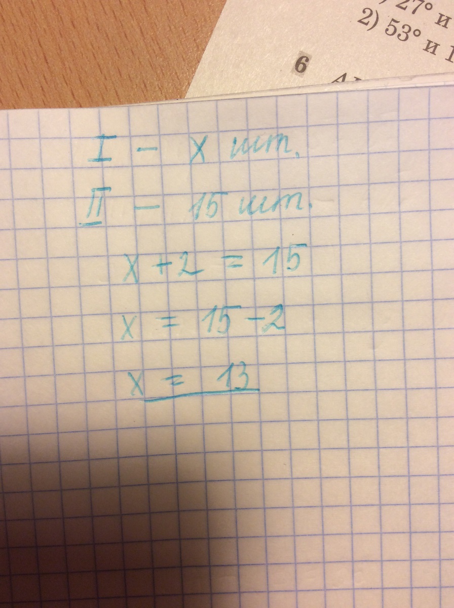 На крыше одного дома сидело Х голубей,другого- 15 голубей.Когда на крышу первого дома сели еще 2 голубя,на обеих крышах их стало поровну.Сколько голубей сидело на крыше первого дома первоначально?