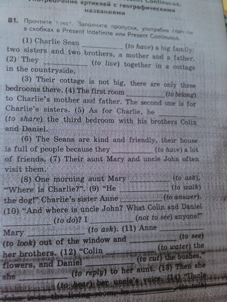 1.has 2.live 4.belong 5.shares 6.have 8.asks 9. he's walking, answers 10. doing, don't see 11.looking, seeing. 12.waters,cuts, replys 13.hears 14. talks