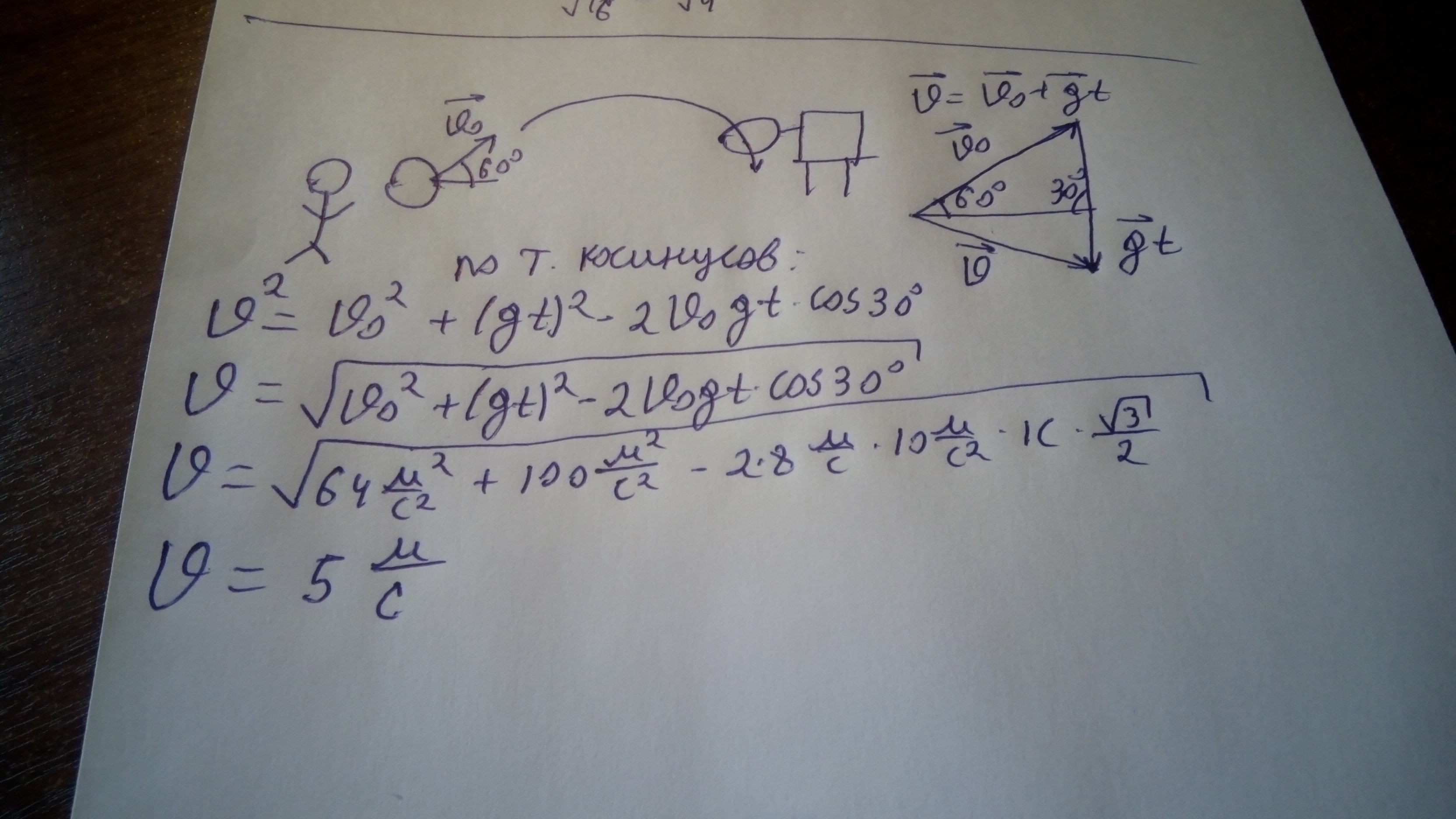 Баскетболист бросает мяч в кольцо. Скорость мяча после броска V = 8 м/с и составляет 60° с горизонтом. С какой скоростью мяч попал в кольцо, если он долетел до него за 1 секунду? Сопротивлением воздуха пренебречь.