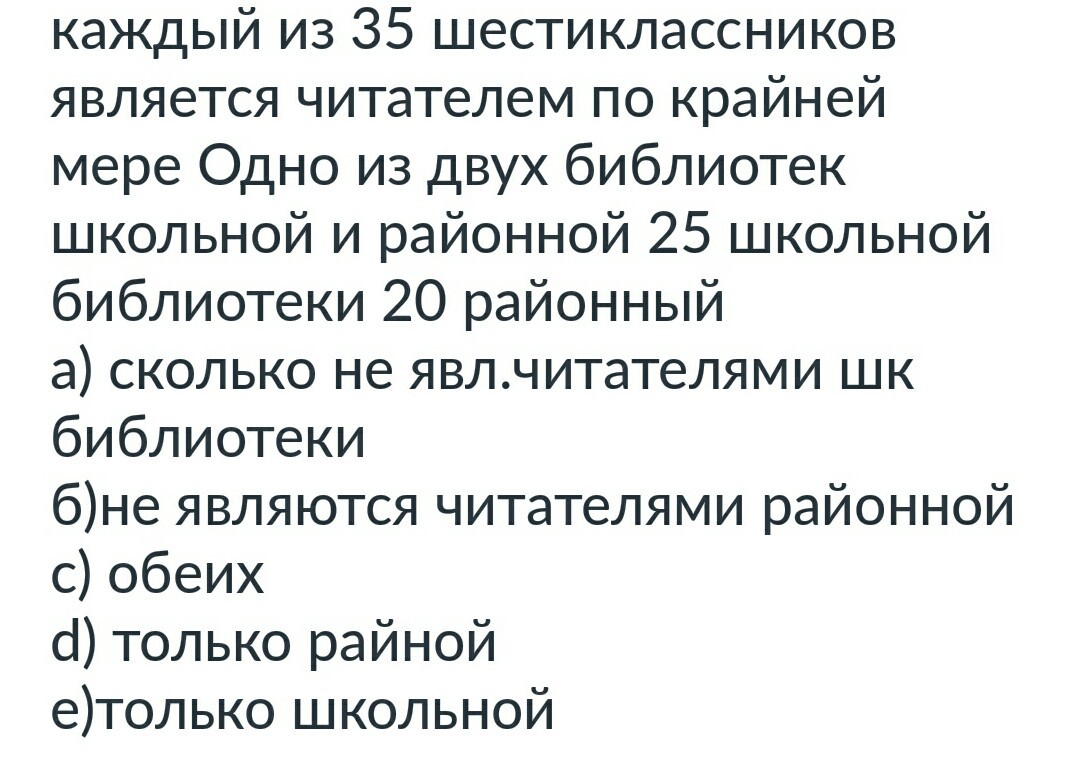 Каждый из 35 шестиклассников является читателем, по крайней мере, одной из двух библиотек: школьной и районной. Из них 25 человек берут книги в школьной библиотеке, 20 – в районной.