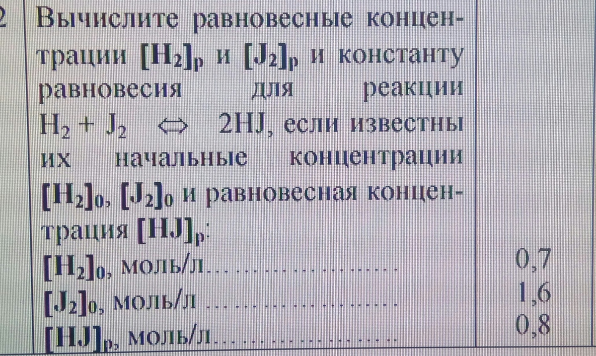 Помогите! Даю 30 баллов! Вычислите равновесные концентрации [Н2]р и [J2]р и константу равновесия для реакции Н2 + J2 ⇔ 2НJ, если известны их начальные концентрации [Н2]0, [J2]0 и равновесная концентрация [НJ]р: