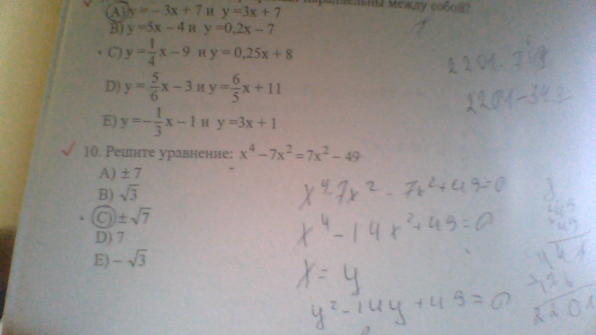 x^4-7x^2=7x^2-49\ x^4-14x^2+49=0\ (x^2-7)^2=0\ x^2=7\ x=pm sqrt{7}