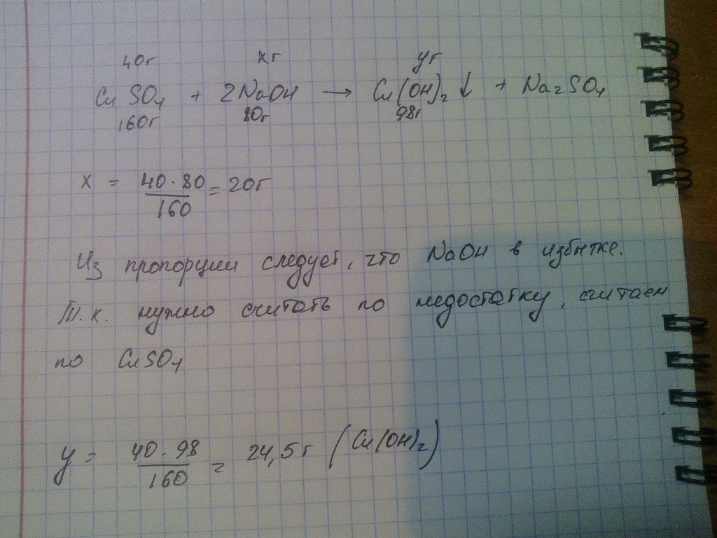 ОТВЕТ во вложении Сколько грамм осадка получится при взаимодействии 40 грамм сульфата меди(2) и 40 грамм гидроксида натрия?
