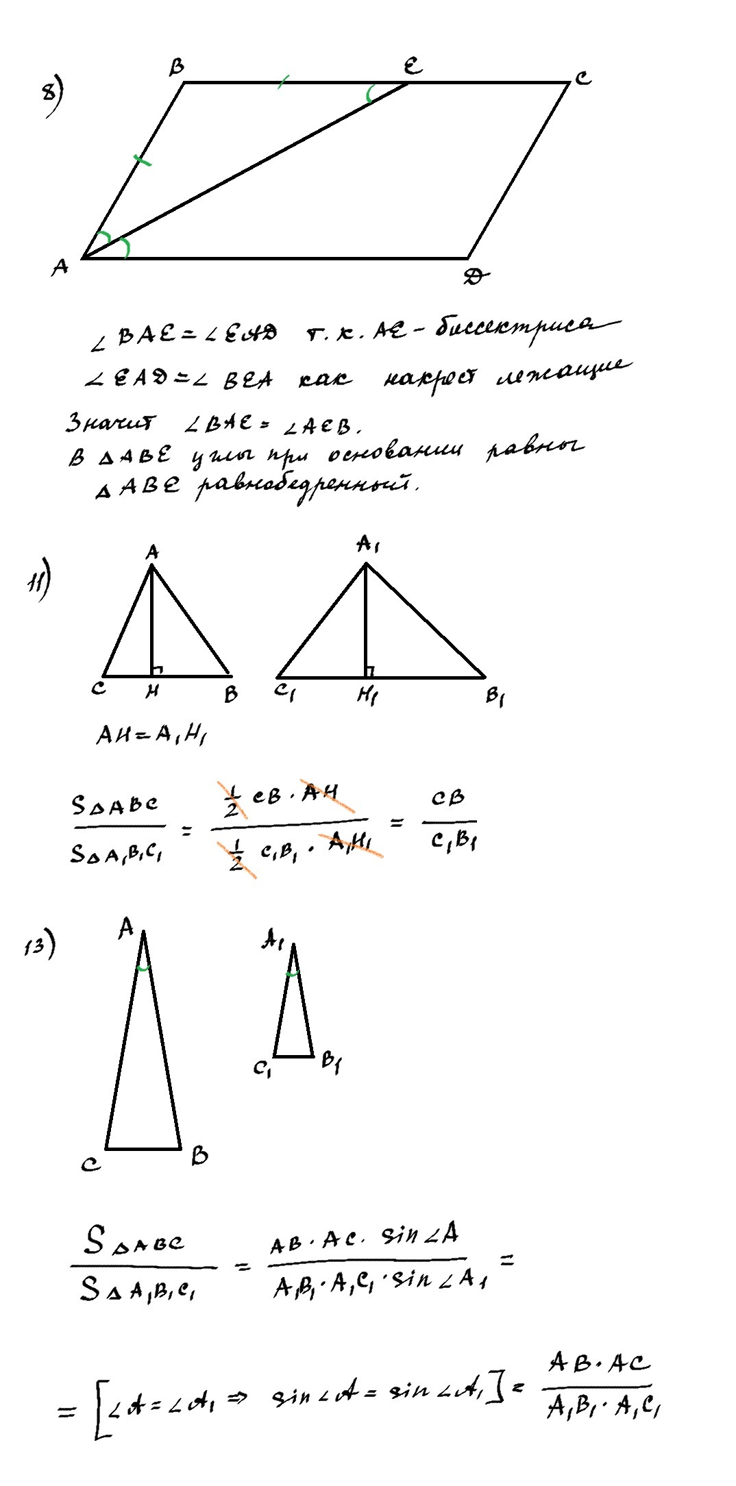 11. Если в треугольниках АВС и А1 В1 С1 высоты АН и А1 Н1 равны, то Sabc:Sa1b1c1= BC:B1C1