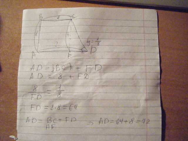 тангенс острого угла прямоугольной трапеции равен 1/8. Найдите ее большее основание если меньшее основание равно высоте и равно 8. Если можно, то с рисунком