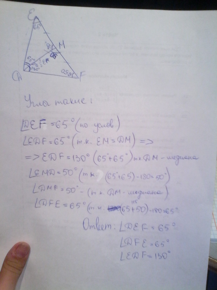 dm=1/2 ef и угол def равен 65 градусов. Найдите углы треугольника def