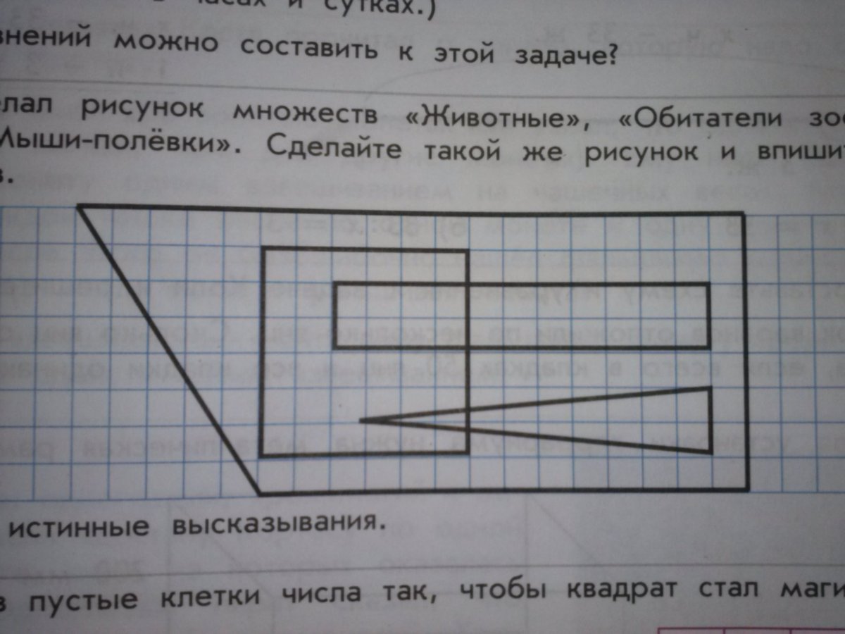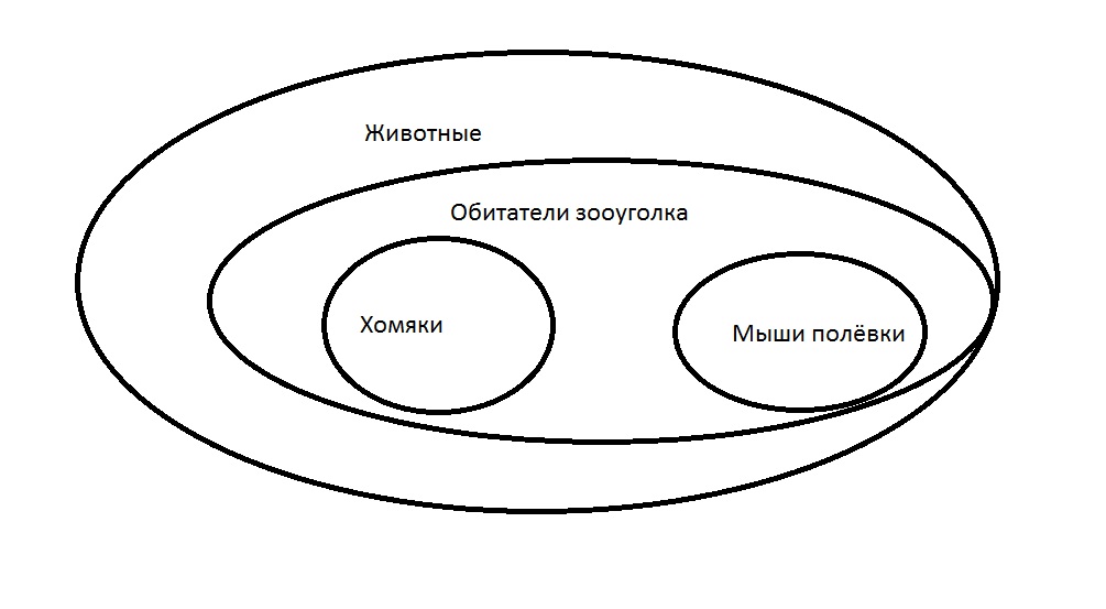 Коля сделал рисунок множеств "Животные, Обитатели зооуголка", Хомяки, Мыши-полевки. Сделай такой же рисунок и впиши названия множеств