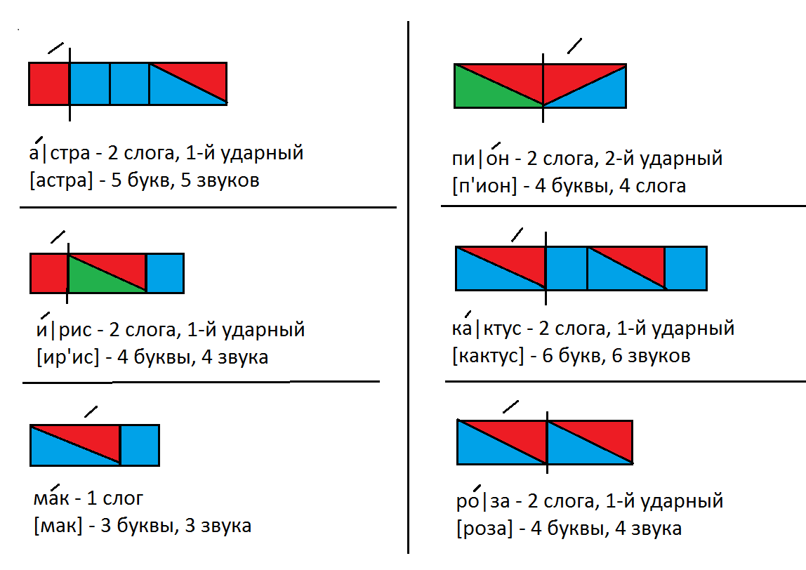 Помогите составить схему слова: астра, ирис, мак, пион, кактус,роза (должны быть разукрашенные квадратики) 1 класс