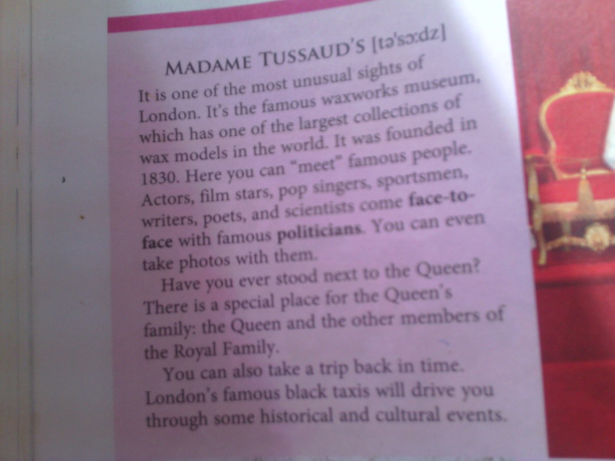 Это одно из самых необычных мест в Лондоне. Это знаменитый музей восковых фигур, который имеет самую большую коллекцию фигур во всем мире. Он был основан в 1830 году. Здесь вы можете "встретить" знаменитостей. Актеры, звезды фильмов, поп певцы, спортсмены, писатели, поэты, и ученые стоят лицом к лицу с знаменитыми политиками. Вы даже можете сфотографироваться с ними.