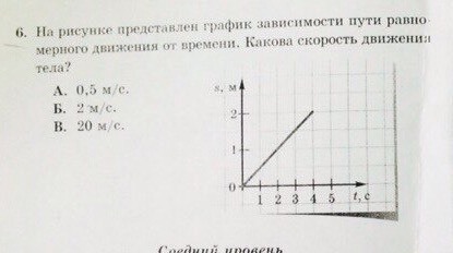 На рисунке предоставлен график зависимости пути равномерного движения от времени.Какова скорость движения тела?