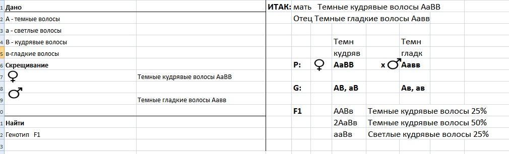1. Темноволосая женщина с кудрявыми волосами, гетерозиготная по первому признаку, вступила в брак с мужчиной, имеющим темные гладкие волосы, гетерозиготным по первой аллеи. Каковы вероятные генотипы детей?