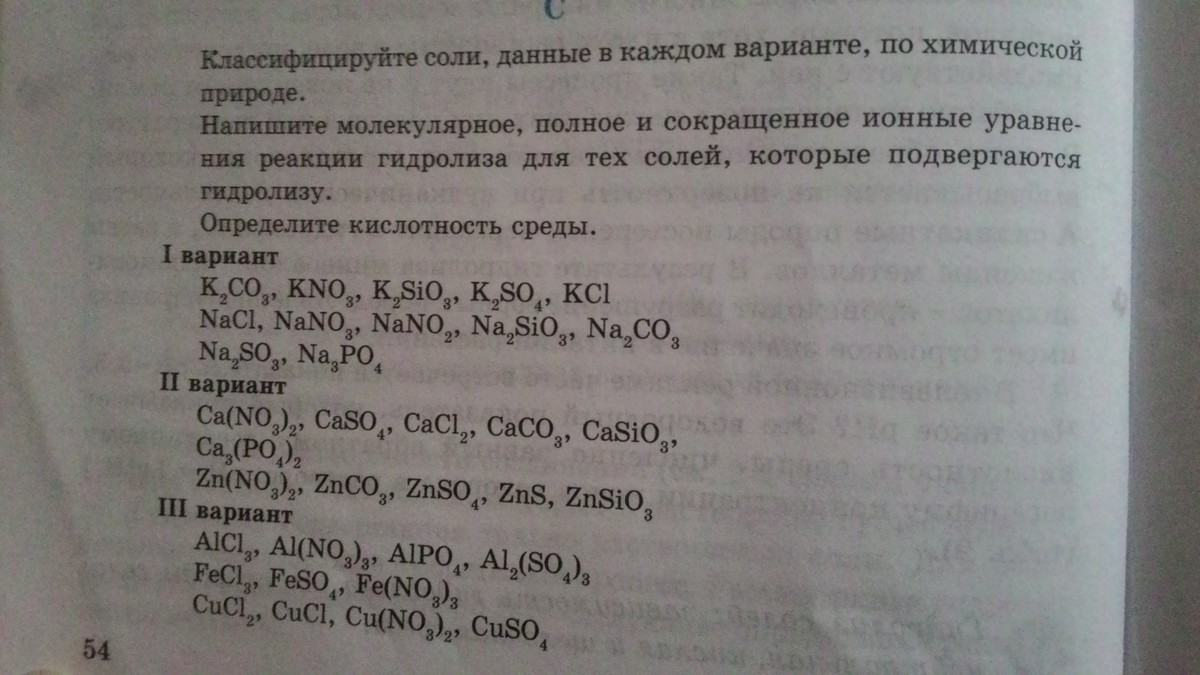 классифицируйте соли , данные в каждом варианте, по химической природе, напишите молекулярное, полное и сокращенное ионные уравнения реакции гидролиза для тех солей которые подвергаются гидролизу, определите кислотность среды.