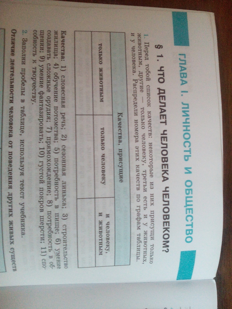 перед тобой список качеств: ненекоторые из них присущи только животным, другие - только человеку, третьи есть и у животных, и у человека. Распредели номера этих качеств по графам таблицы