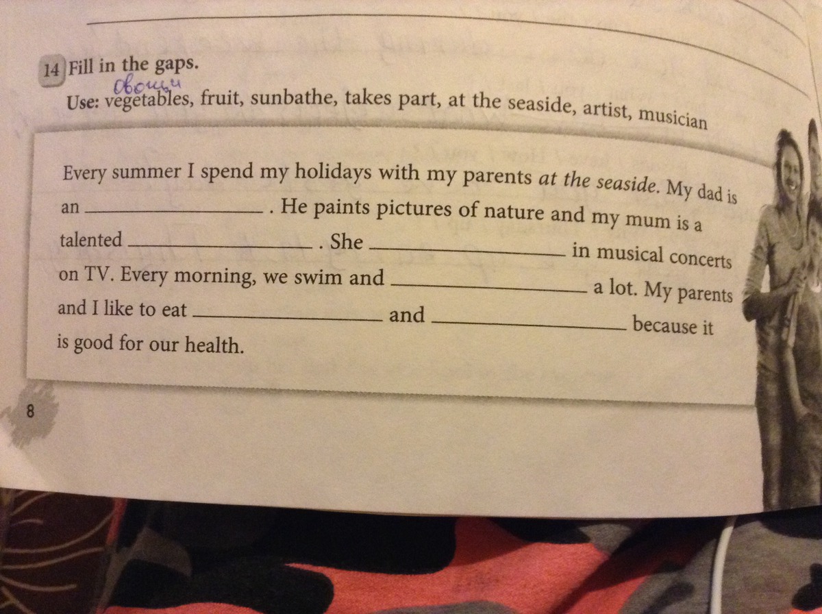 14: artist, musician, takes part, sunbathe, vegetables, fruit