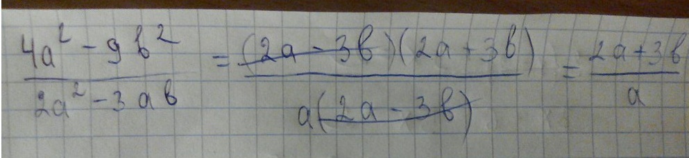 Числитель раскладываем как (2a-3b)*(2a+3b) в знаменателе выносим a за скобку получиттся a*(2a-3b) получается (2a-3b) сокращаются остается (2a+3b)/a