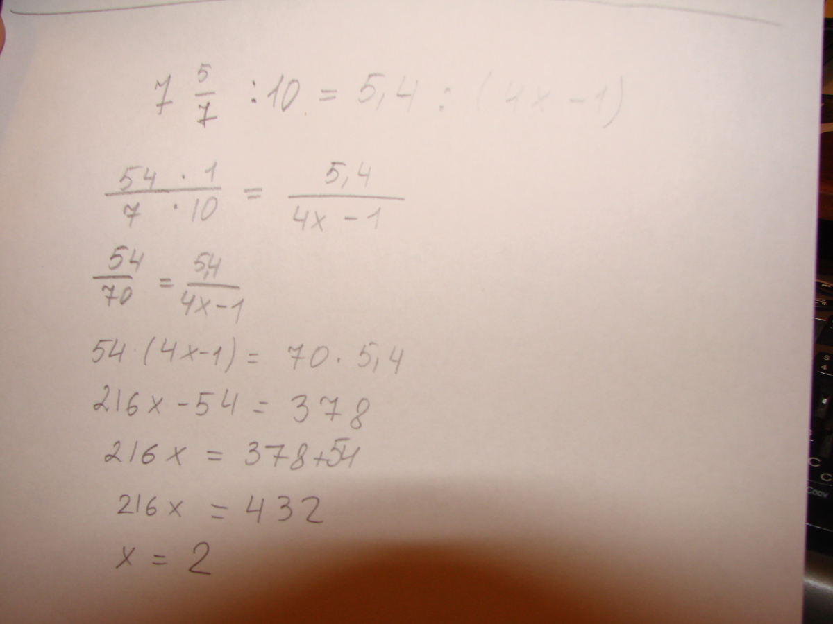 решите 2 уранения 1)7 целых дробь 5 седьмых:10=5,4:(4x-1) ответ 2 но нужно решение