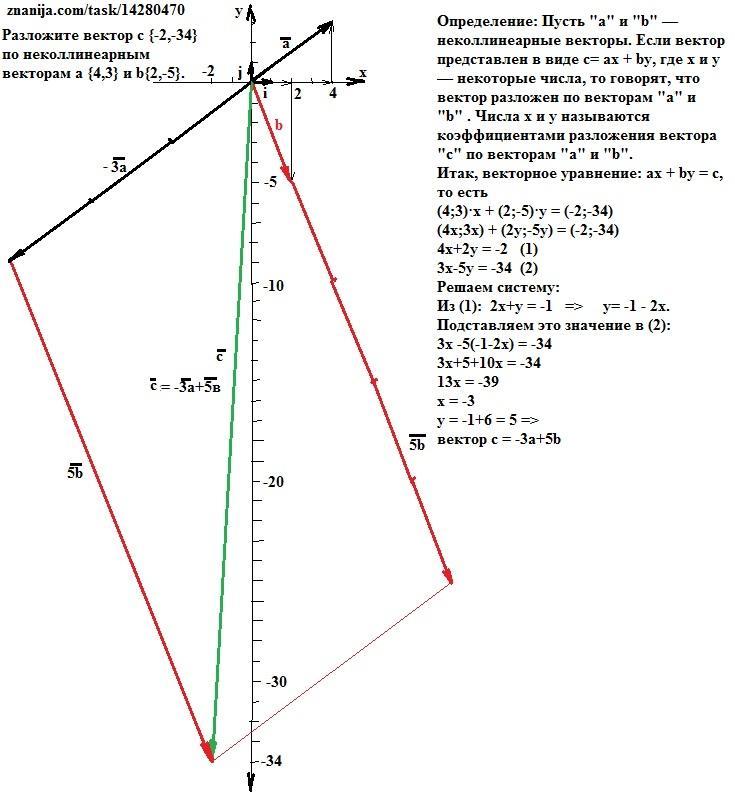 Определение: Пусть "a" и "b" - неколлинеарные векторы. Если вектор представлен в виде c= ax + by, где x и y - некоторые числа, то говорят, что вектор разложен по векторам "a" и "b" . Числа x и y называются коэффициентами разложения вектора "c" по векторам "a" и "b".