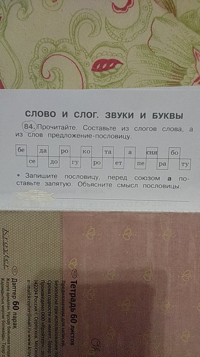 Прочитайте. Составьте из слогов слова, а из слов предложение -пословицу.Запишите пословицу, перед союзом, а поставьте запятую. Объясните смысл пословицы.