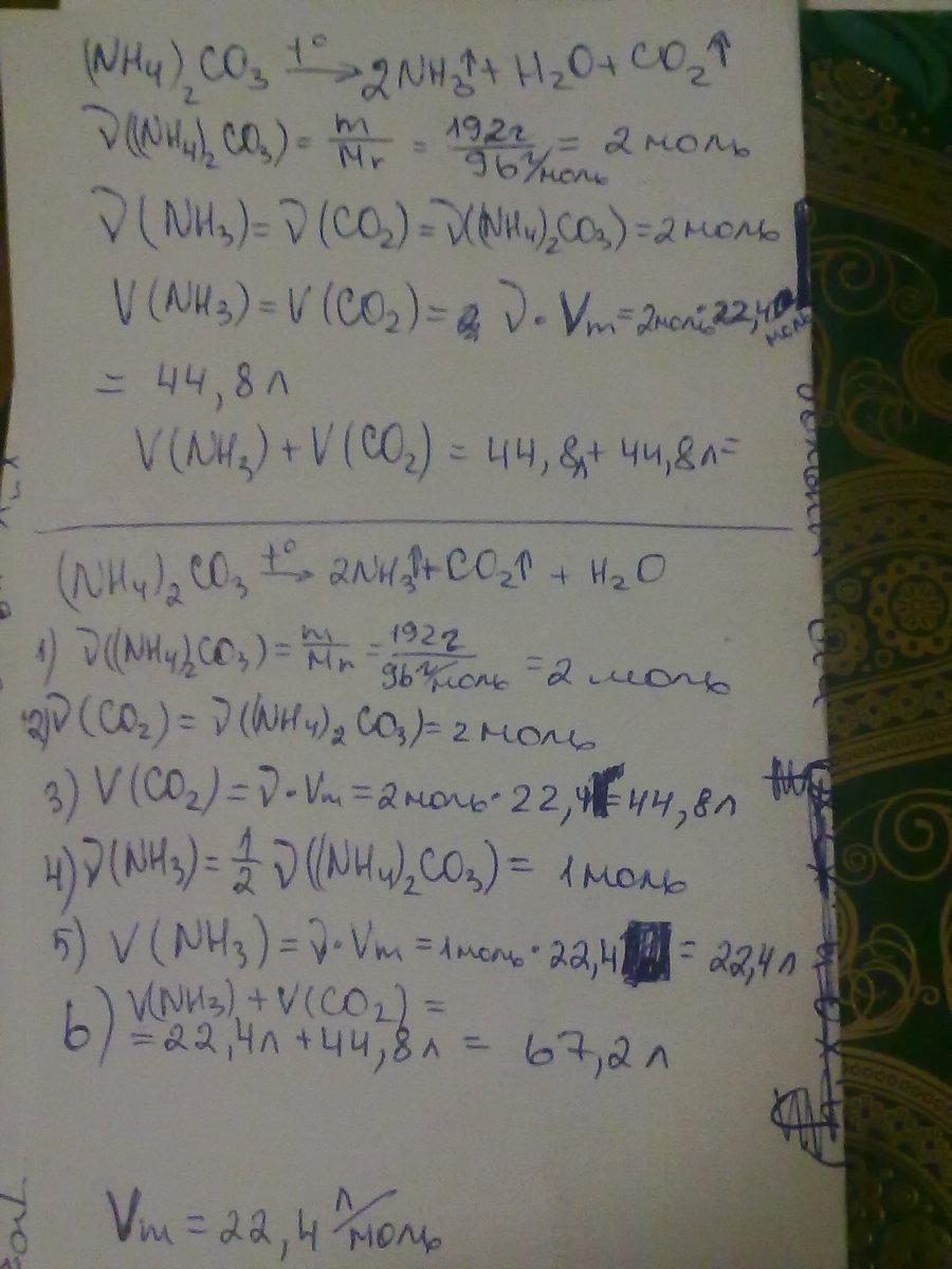 Прокаливанием 192г карбоната аммония получена смесь двух газов(водяной пар не учитывать) общим объемом(н.у.):