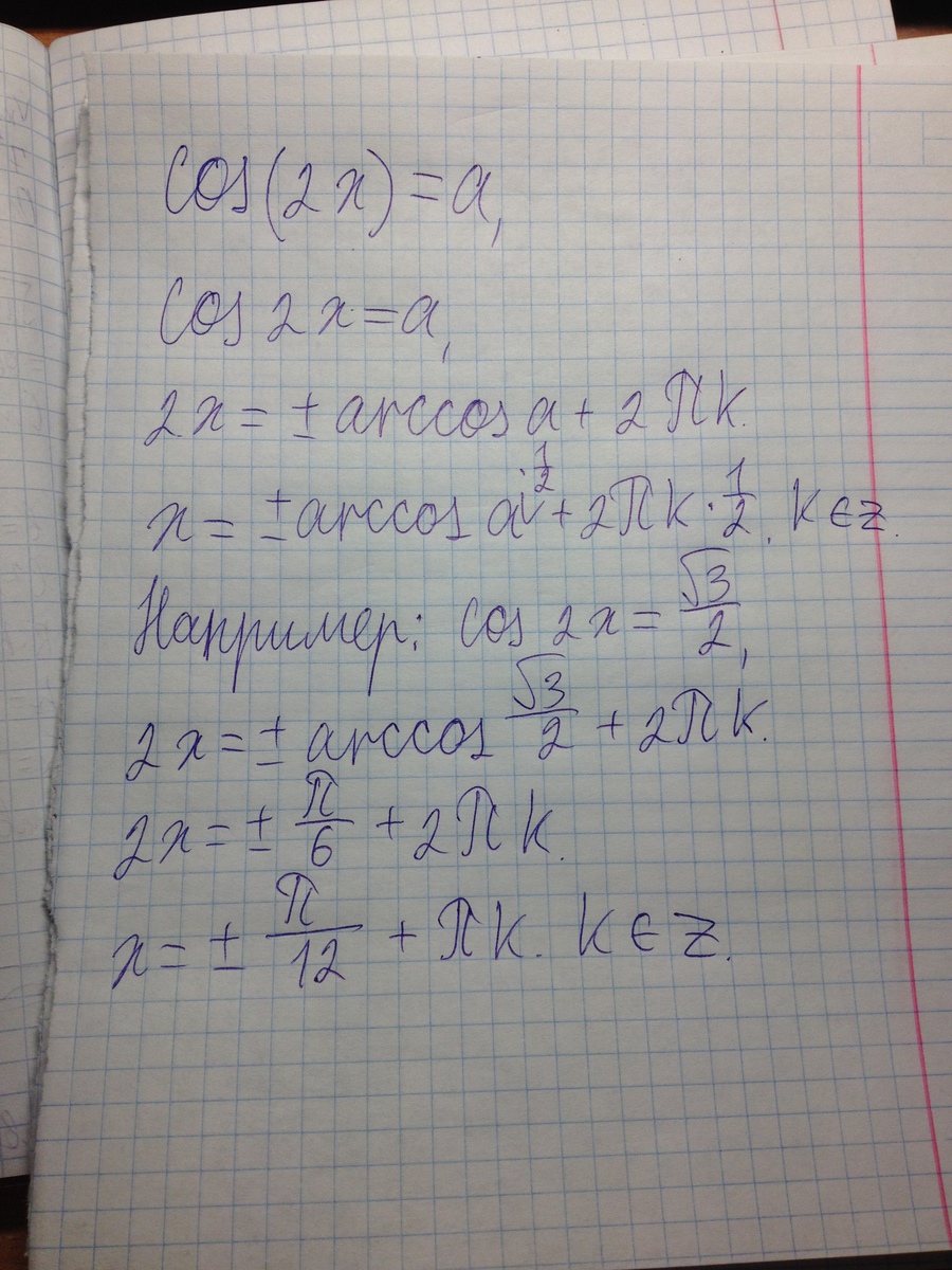 Пример написала для того, чтобы Вам было понятно. Сначала находим значение 2х, а потом уже х. Для того, чтобы избавиться от 2, нужно в правой части все умножить на 1/2, значение арккосинуса и 2Пк. Но если Вам попадется, например, х=арккосинус нетабличного значения(например, 3/2) то это значение так и остается, Вы умножаете только 2Пк, это значение не трогаете.