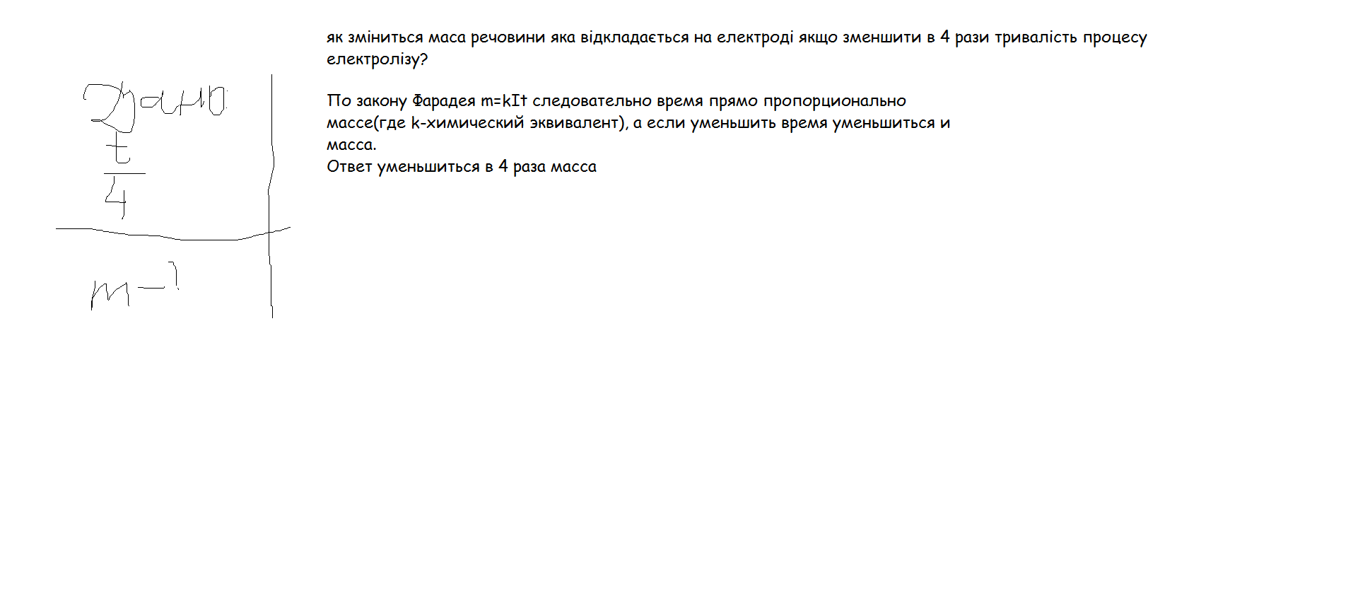 як зміниться маса речовини яка відкладається на електроді якщо зменшити в 4 рази тривалість процесу електролізу?