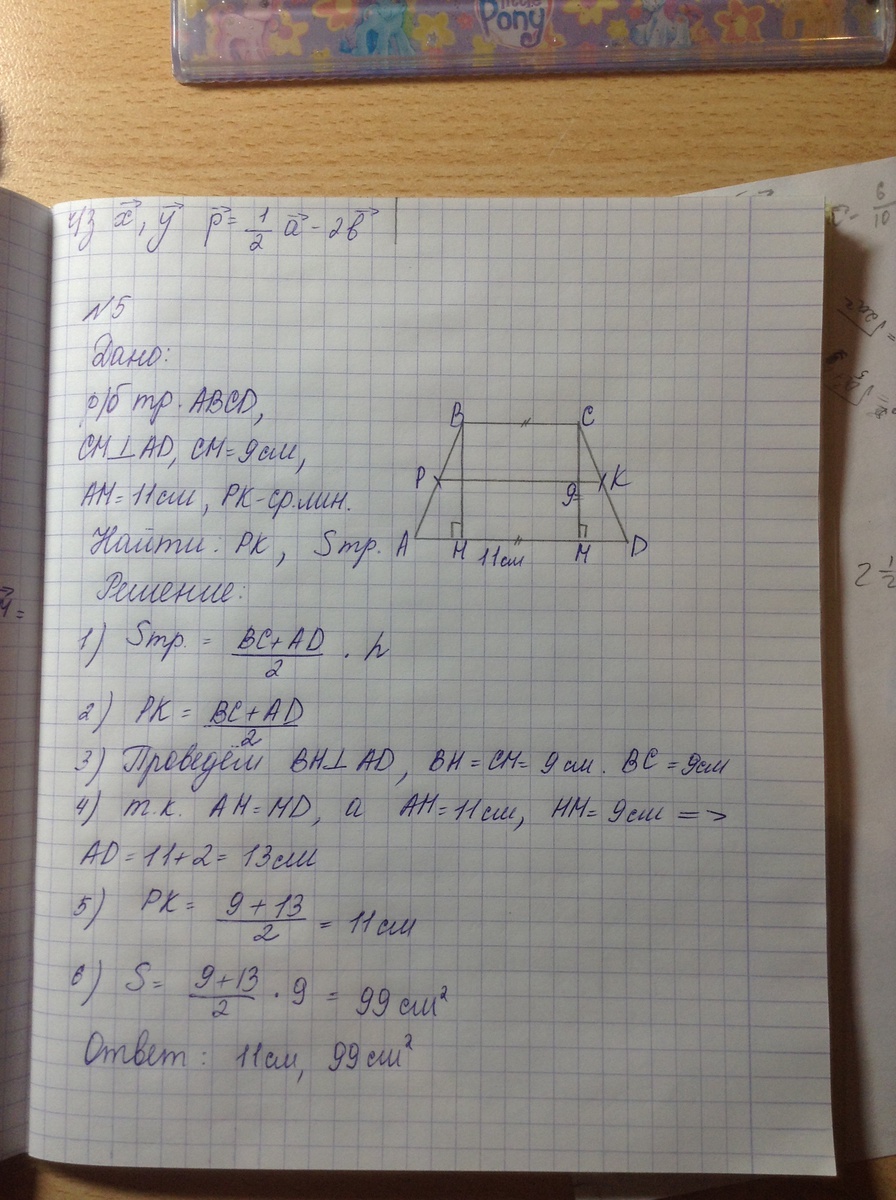Я точно не уверена, но возможно это решается так. Для начала надо провести еще одну высоту, эти высоты буду равны. Получится квадрат, отсюда ВС=9 см. Маленькие кусочки АН=МD=2, тк НМ=9, а АМ=11 => АD=11+2=13. Ну, а далее по формулам