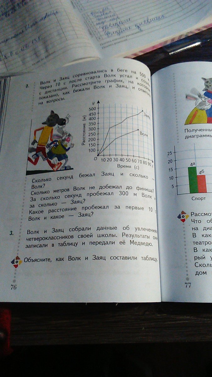 волк и заяц сореановались в беге на 500 м через 70 с после старта волк устал и сошёл с дистанции расмотрите график на котором показано как бежали волк и заяц и ответьте на вопросы