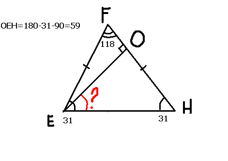 в равнобедренном треугольнике EFH угол F = 118 градусов EO-высота этого треугольника найдите угол OEH