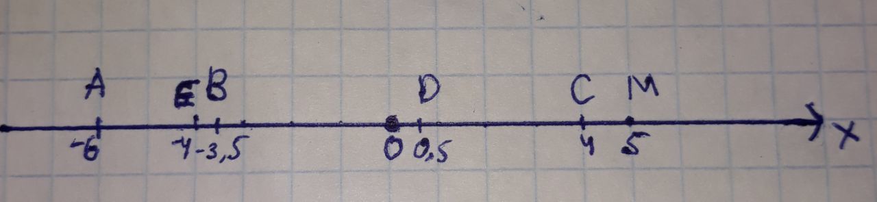 1.Отметьте на координатной прямой точки А (-6),B (-3,5),C (4),D (0,5),E (-4),M(5).Ответьте на вопросы:а)Какие из точек имеют противоположные координаты? б)В какую точку перейдет точка C при перемещении по координатной прямой на 10 единиц влево; на 1 единицы вправо?