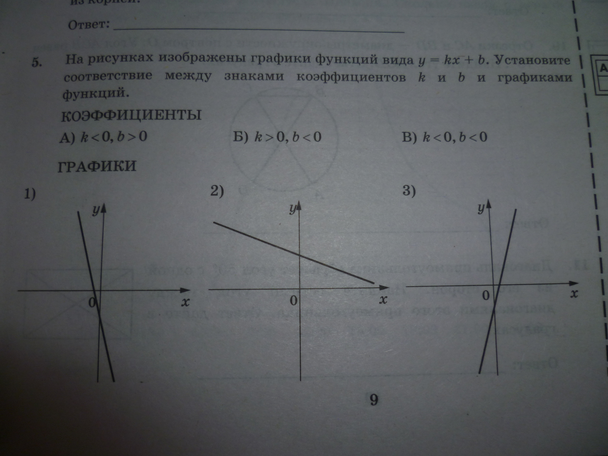 На рисунках изображены графики функций вида у=kx+b,Установите соответствие между знаками коэффициентов k и b и графиками функций