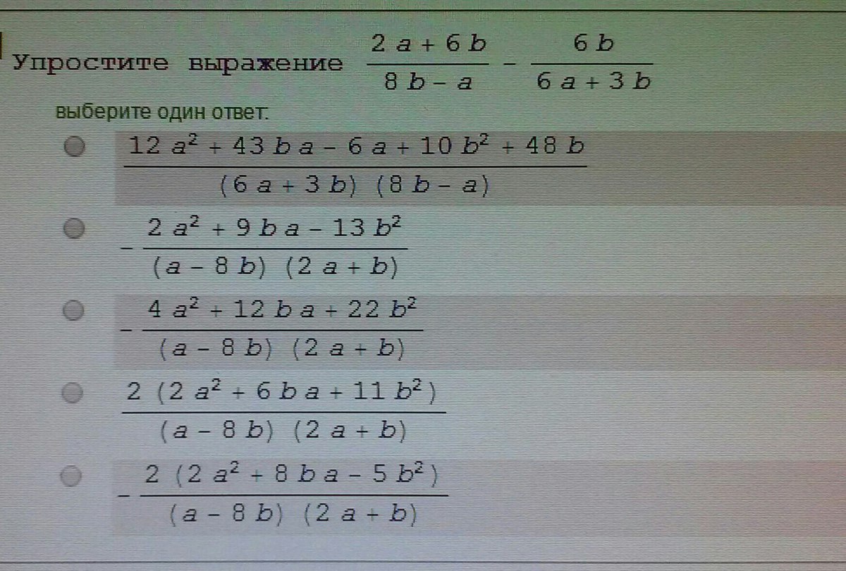 frac{2a+6b}{8b-a}- frac{6b}{6a+3b}=   2frac{a+3b}{8b-a}- 2frac{b}{2a+b}=2 frac{(a+3b)(2a+b)-b(8b-a)}{(8b-a)(2a+b)}=