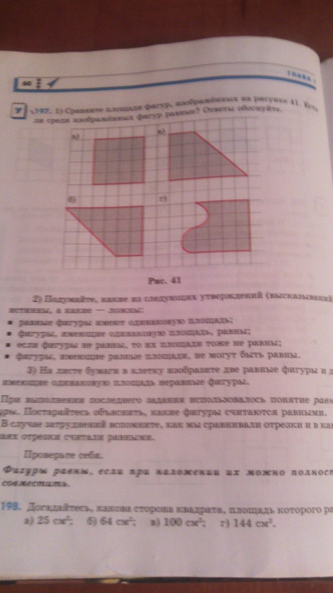Сравните площади фигур ,изображённых на рисунке 41 Есть ли среди изображённых фигур равные?:Ответы обоснуйте Заранее спасибо