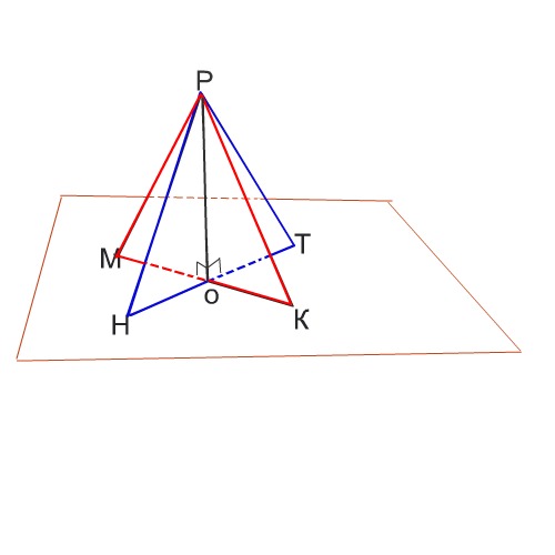 Так как оба данных треугольника равнобедренные, медиана у них общая и перпендикулярна двум их основаниям в одной точке, то PO перпендикулярна плоскости MHK, что и требовалось доказать.