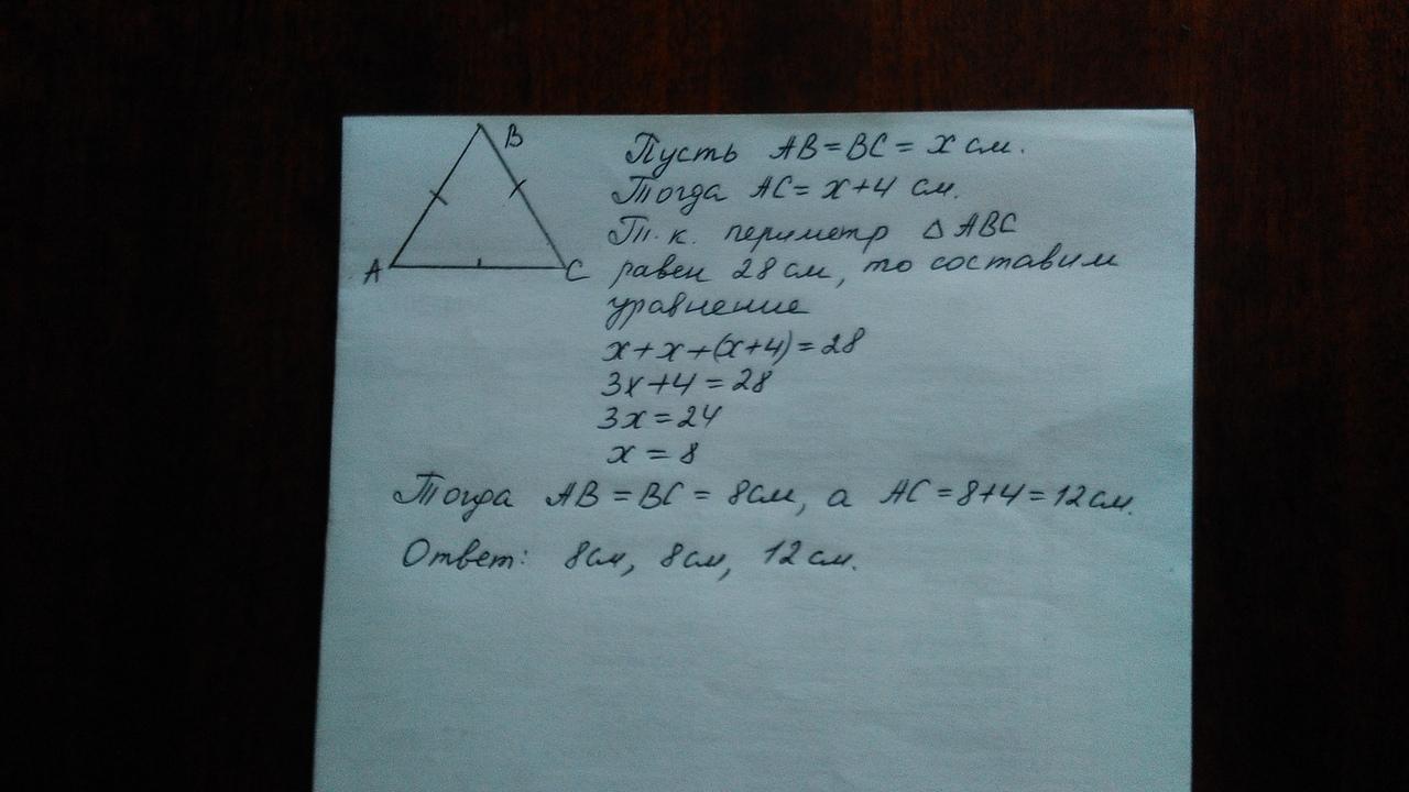 периметр равнобедренного треугольника равен 28 см. найдите стороны треугольника, если его основание на 4 см больше боковой стороны