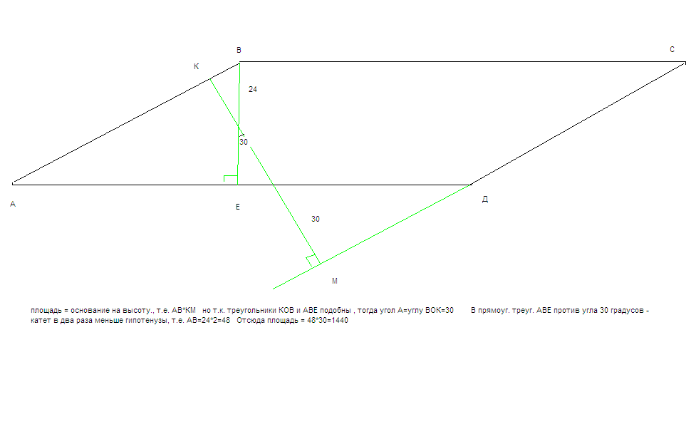 ОЧЕНЬ НУЖНА ПОМООЩЬ!!!!Высоты параллелограмма равны 24 и 30 см ,а угол между ними 30 градусов.Найти площадь параллелограмма.