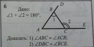 Легко, смотри у нас <ABD и <ACE - развернутые...значит они равны по 180 градусов, значит их сумма равна 360 градусов...у тя <ABD это <ABC+<CBD и <ACE это <ACB+<BCE, значит <ABC+<CBD+<ABC+<CBD=<ABD+<ACE=180+180=360. Если <ABD это <ABC+<CBD и <1+<2=180, то <CBD=<ABD-<ABC=180-<1=<2=<BCE и если <ACE это <ACB+<BCE, то <ACB=<ACE-<BCE=180-<2=<1=<ABC, что и требовалось доказать...